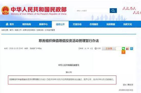 近日,民政部发布《慈善组织保值增值投资活动管理暂行办法》,明确了慈善组织可以开展投资活动,《办法》已于10月25日通过,将于2019年1月1日起施行。慈善组织开展投资活动应当遵循合法、安全、有效的原则,投资取得的收益应当全部用于慈善目的。