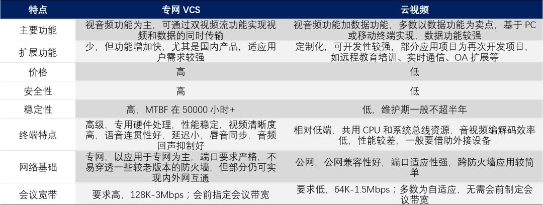 与云视频相对应的是VCS(Video conferphone system),也即会议电视系统,其需要的设备更复杂,厂商竞争更激烈,通常需要搭建专网以及专业的设备,即需要自建视频会议系统,并需要专人维护,这一领域的客户主要是对安全性需求较高的政府以及一些大型企业。